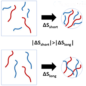 Understanding the thermodynamics that drive liquid-liquid phase separation (LLPS) is quite important given the number of diverse biomolecular systems undergoing this phenomenon. Many studies have focused on condensates of long polymers, but very few systems of short-polymer condensates have been observed and studied. Here, we study a short-polymer system of various lengths of poly-adenine RNA and peptides formed by the RGRGG sequence repeats to understand the underlying thermodynamics of LLPS. Using the recently developed COCOMO coarse-grained (CG) model, we predicted condensates for lengths as short as 5–10 residues, which was then confirmed by experiment, making this one of the smallest LLPS systems yet observed. A free-energy model reveals that the length dependence of condensation is driven primarily by entropy of confinement. The simplicity of this system will provide the basis for understanding more biologically realistic systems.
