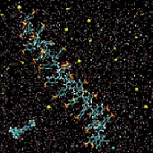 Polyelectrolytes continue to find wide interest and application in science and engineering, including areas such as water purification, drug delivery, and multilayer thin films. We have been interested in the dynamics of small molecules in a variety of polyelectrolyte (PE) environments; in this paper, we report simulations and analysis of the small dye molecule rhodamine B (RB) in several very simple polyelectrolyte solutions. Translational diffusion of the RB zwitterion has been measured in fully atomistic, 2 μs long molecular dynamics simulations in four different polyelectrolyte solutions. Two solutions contain the common polyanion sodium poly(styrene sulfonate) (PSS), one with a 30-mer chain and the other with 10 trimers. The other two solutions contain the common polycation poly(allyldimethylammonium) chloride (PDDA), one with two 15-mers and the other with 10 trimers. RB diffusion was also simulated in several polymer-free solutions to verify its known experimental value for the translational diffusion coefficient, DRB, of 4.7 × 10–6 cm2/s at 300 K. RB diffusion was slowed in all four simulated PE solutions, but to varying degrees. DRB values of 3.07 × 10–6 and 3.22 × 10–6 cm2/s were found in PSS 30-mer and PSS trimer solutions, respectively, whereas PDDA 15-mer and trimer solutions yielded values of 2.19 × 10–6 and 3.34 × 10–6 cm2/s. Significant associations between RB and the PEs were analyzed and interpreted via a two-state diffusion model (bound and free diffusion) that describes the data well. Crowder size effects and anomalous diffusion were also analyzed. Finally, RB translation along the polyelectrolytes during association was characterized.