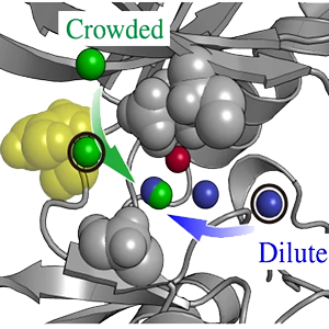 The inside of a cell is highly crowded with proteins and other biomolecules. How proteins express their specific functions together with many off-target proteins in crowded cellular environments is largely unknown. Here, we investigate an inhibitor binding with c-Src kinase using atomistic molecular dynamics (MD) simulations in dilute as well as crowded protein solution. The populations of the inhibitor, 4-amino-5-(4-methylphenyl)−7-(t-butyl)pyrazolo[3,4-d]pyrimidine (PP1), in bulk solution and on the surface of c-Src kinase are reduced as the concentration of crowder bovine serum albumins (BSAs) increases. This observation is consistent with the reduced PP1 inhibitor efficacy in experimental c-Src kinase assays in addition with BSAs. The crowded environment changes the major binding pathway of PP1 toward c-Src kinase compared to that in dilute solution. This change is explained based on the population shift mechanism of local conformations near the inhibitor binding site in c-Src kinase.