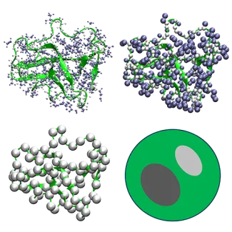 We have developed coarse-grained models at different resolutions that can connect directly with experiments and biology. Models developed by us include the high-resolution PRIMO model, the residue-level COCOMO model, and sphere models of biomolecules.